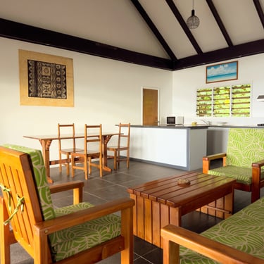 Generous living space with two queen beds, full kitchen, dining area, and lounge — ideal for families or groups. Enjoy the balance of privacy, flexibility, and the warmth of island hospitality.